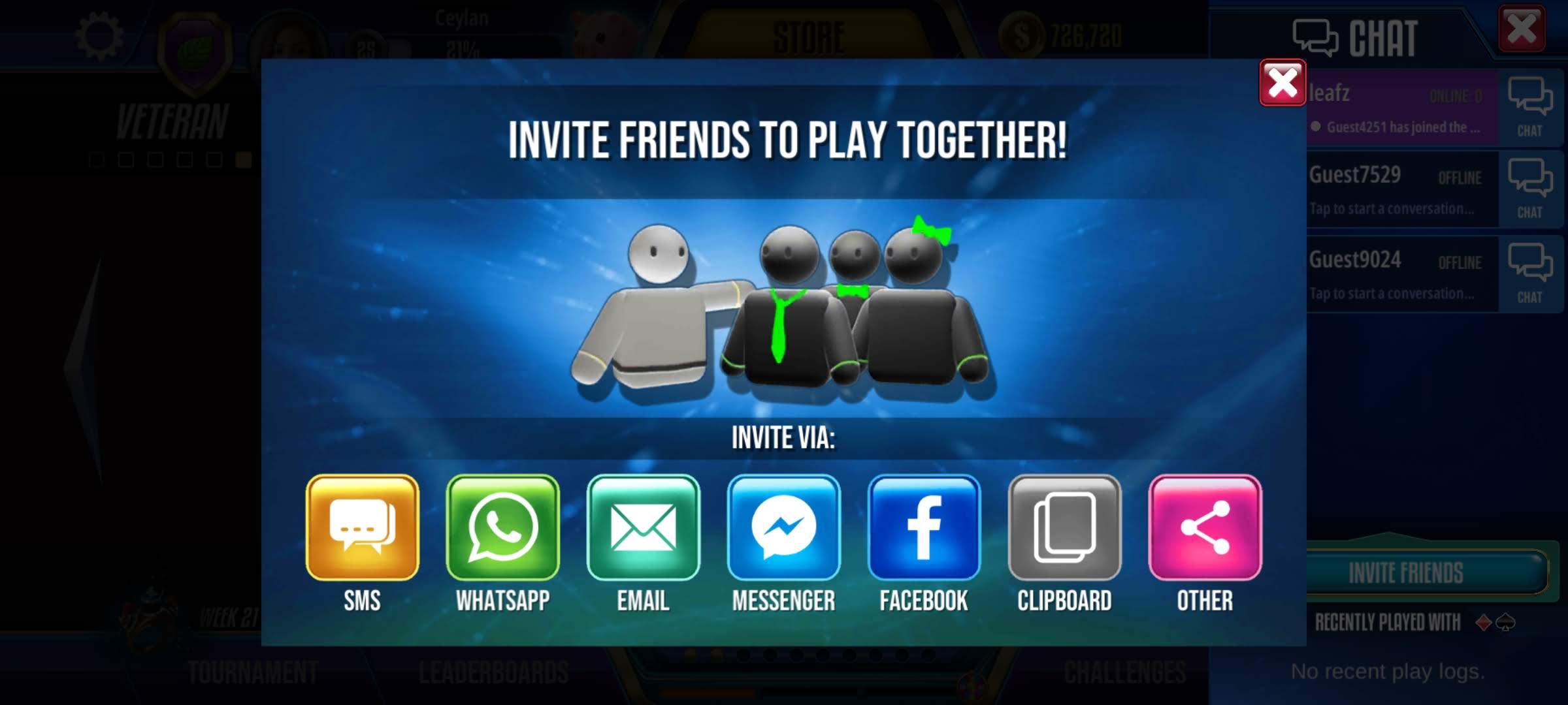 • Also, you can tap the FRIENDS icon and the INVITE FRIENDS button. You will find a list of platforms via which you can invite your friends.